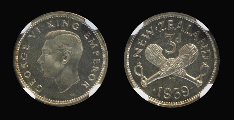 PROOF Threepence 1939, NGC PF66, 3724660-006, the only NGC graded example, ex Stacks Bowers 16/8/2016, very sharply struck, with the expected Proof tone & contrast, very attractive & like other George VI silver, exceptionally rare.