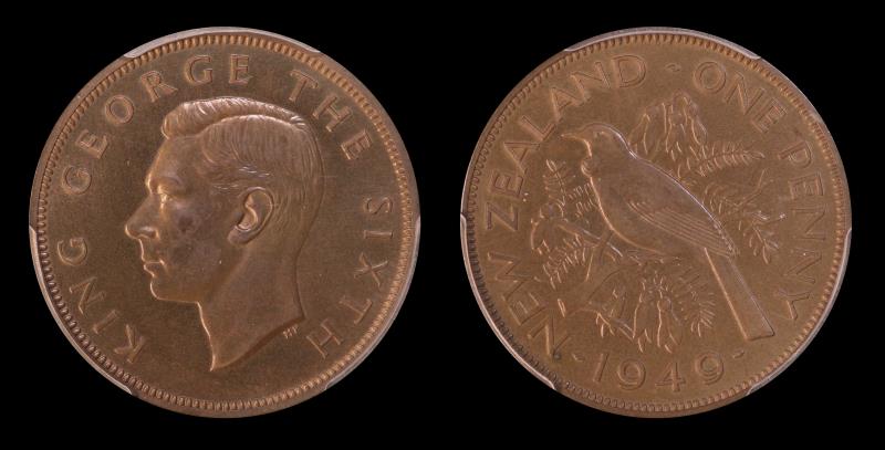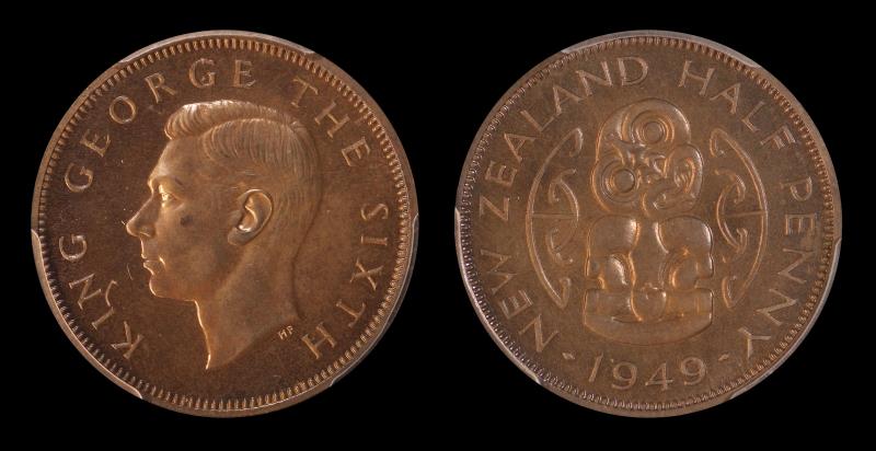 PROOF HALFPENNY 1949, fields/tone PCGS PR65RB, 409800.65/51678070, the highest RB grade by PCGS, the first offered by Mowbrays, with authentic proof strike, tone, contrast between fields & design. In short, fully justifying PR65RB & very rare.