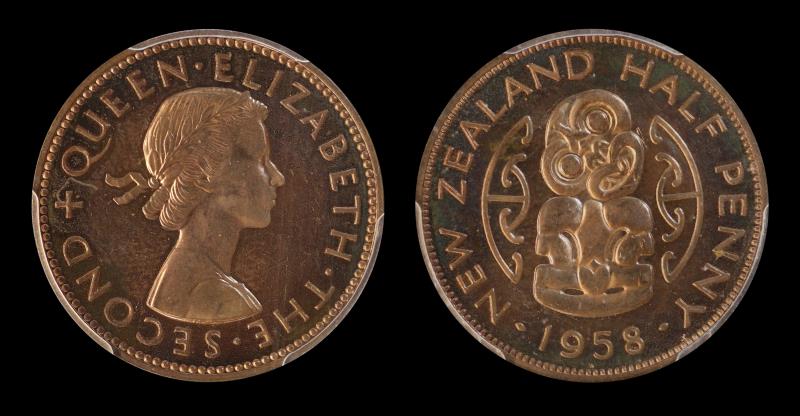 PROOF HALFPENNY 1958, fields/tone PCGS PR64RB, 408049.64/51678066, the highest PCGS graded & the first 1958 offered by Mowbrays, with authentic proof strike & tone & very rare.