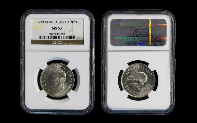FLORIN 1943, outstanding Rev, sharp rim, with indication of early collar failure, NGC MS63. BU