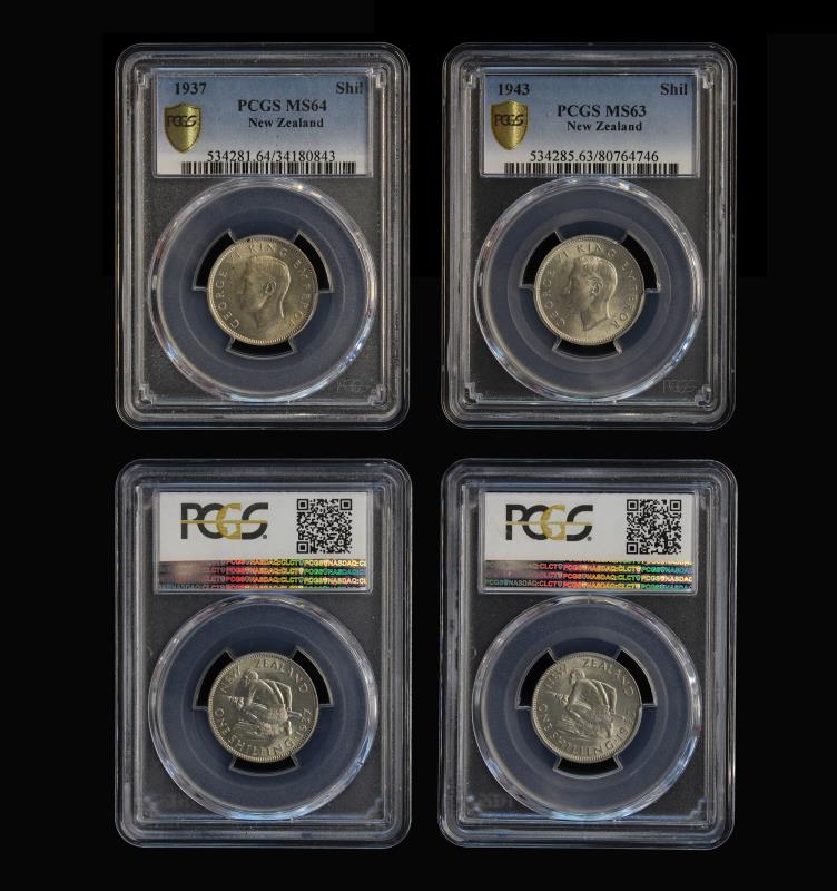 SHILLINGS (2), 1937, two small spots Obv, PCGS MS64; & 1943, excellent example, PCGS MS63. UNC