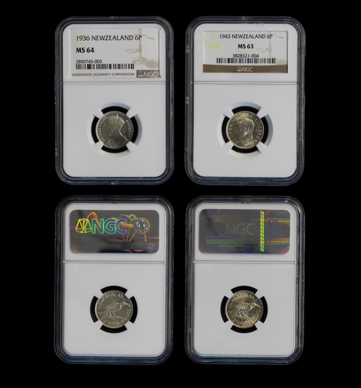 SIXPENCES (2), 1936, NGC MS64; & 1943, MS63. UNC