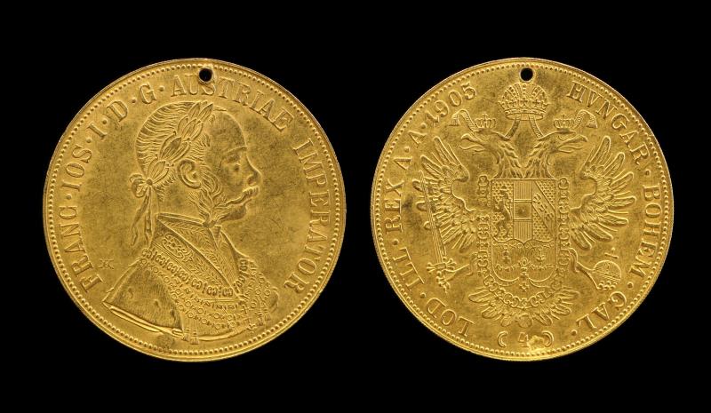 BULGARIA Bulgarian imitation of AUSTRIA 4 Ducat 1905, XO control mark on Obv, Crown countermark at lower Rev, N186091, imitating km2276, .917 gold and confirmed by XRF testing, .382 oz AGW, tone spot rev, pierced for ceremonial usage. EF