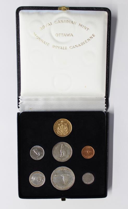 CANADA $20 1967, Centennial, km71, within specimen set of 7 coins in black plush case & box, kmPL18B, km65-71, 0.9 gold, .5287 oz AGW. Minor foxing, some toning with some hairlines on all coins. UNC