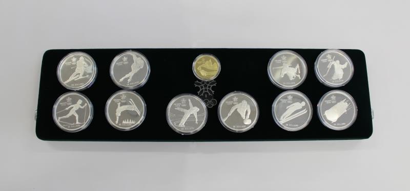 CANADA (11, 1 gold, 10 silver), Proof set for the 1988 Calgary Olympics, $100 1987, km158, .583 gold, .250 oz AGW; $20 (10), 1985-87, km145-8, km150-1 & km155-60, all .925 silver, total 10 oz ASW, cased with certs. PROOF