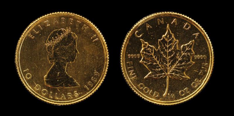 CANADA 10 Dollars 1989, km136, .9999 gold, .25 oz AGW, small tone spots, in plastic as issued. UNC