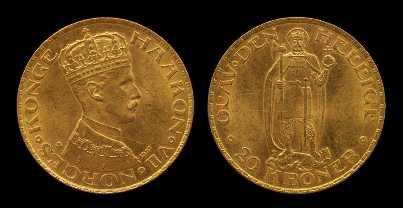 NORWAY 20 Kroner, 1910, km376, Obv Haakon VII, Rev St Olav standing, .900 gold, .288 oz AGW bag mark Rev field, full design details. EF