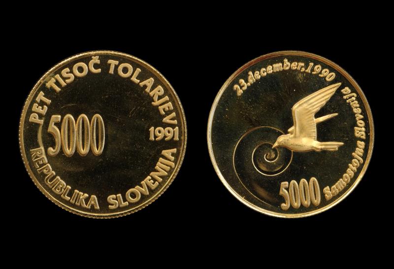 SLOVENIA 5,000 Tolarjev 1991, km2.1, 0.9 gold, 0.2 oz AGW, cased with cert, minor tone spot. PROOF