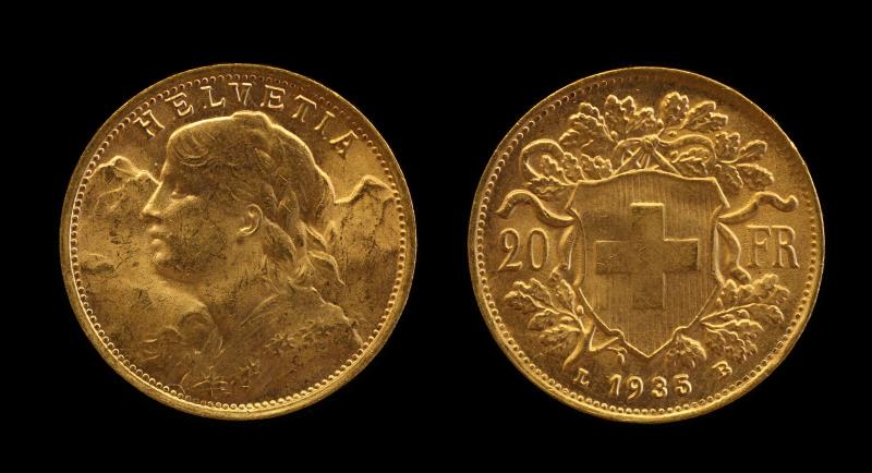 SWITZERLAND 20 Francs 1935B, km35.2, .900 gold, .1867 oz AGW. AU