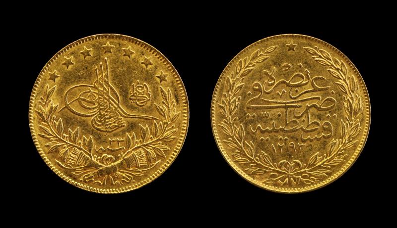 TURKEY Ottoman, Abdul Hamid II 100 Kurush 1293 Year 33 (1906), km730, .917 gold, .2127 oz AGW. gVF