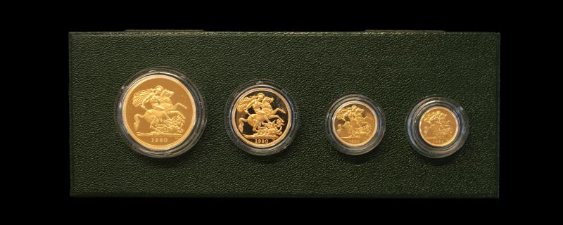 GOLD PROOF SET 1980, Five Pounds, Two Pounds, Sovereign & Half Sovereign, SPGSO1, each .917 gold, total 2 oz AGW, cased with cert. PROOF