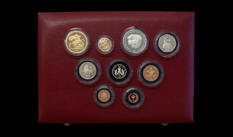 PROOF SET 1981, 9 coins, 5 Pounds & Sovereign, .917 gold; Crown .925 silver; 50p, 10p & 5p, Cu-Ni; 2p, 1p & Halfpenny, Bronze. SPGS02, total 1.4124 oz AGW, .8409 oz ASW, cased & boxed with cert. PROOF