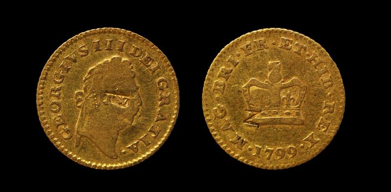 THIRD GUINEA George III, 1799, S3738, First laur hd, crown above date, "TW" stamped on Obv & "Z" Rev, key date. VG