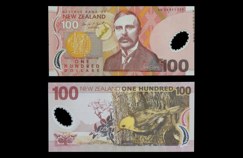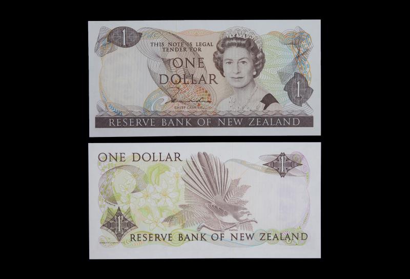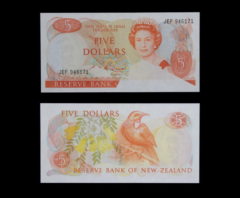 1985-89 RUSSELL $5, JEF 946171, bottom half of QEII missing from obstruction caused by paper fold during printing, staple hole otherwise gVF.