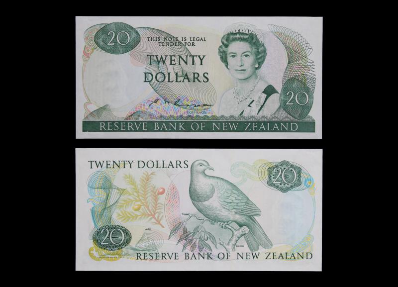 1985-89 RUSSELL $20, missing both serials, two light folds, paper clean & crisp. EF