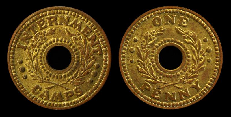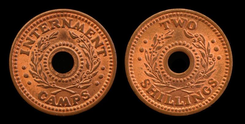 INTERNMENT CAMP Two Shillings, Bronze, hole in centre, used in Australia & NZ, kmTn.4.1, much lustre. UNC.