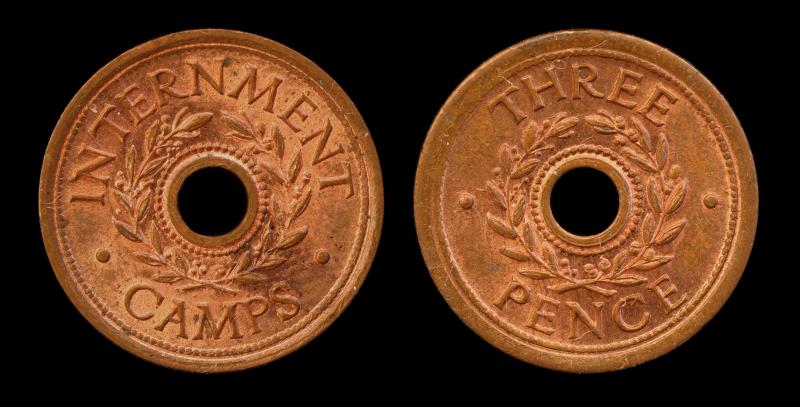 INTERNMENT CAMP Threepence, Bronze, hole in centre, used in Australia & NZ, kmTn.2.1, much lustre. UNC