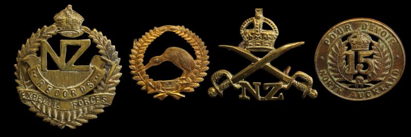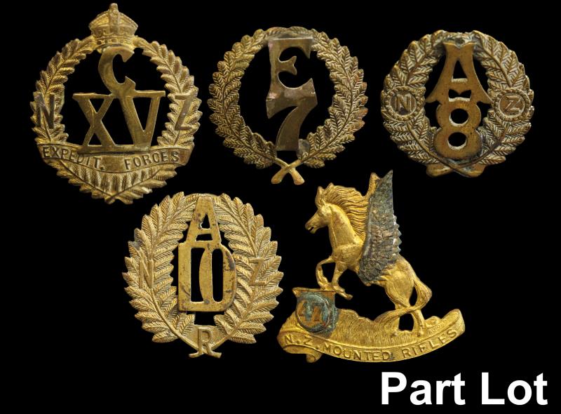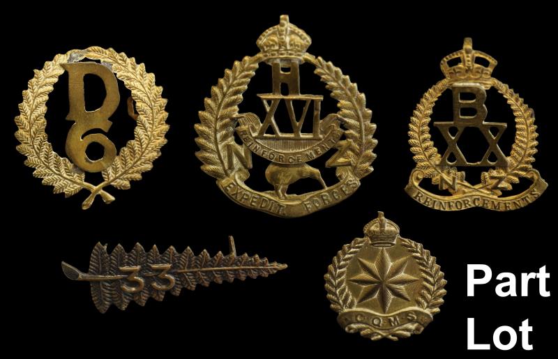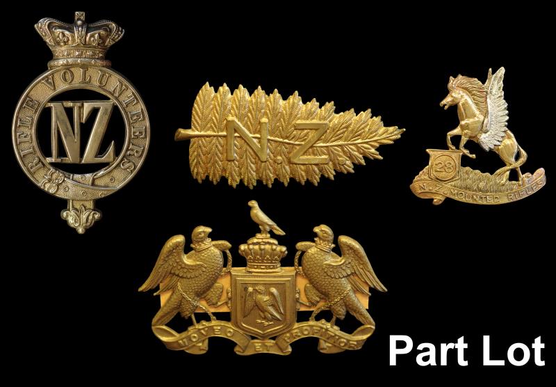 NZ (65), helmet plate, Rifle Volunteers, OLD2/6; glengarry badge, Volunteer fern, OLD2/12; cap badges (46); noted 28th Mounted Rifles Reinforcements, OLD4/203; & 8th South Canterbury Mounted Rifles, OLD5/56; collars (13); shoulder titles (6); all with lugs intact. VF - gEF