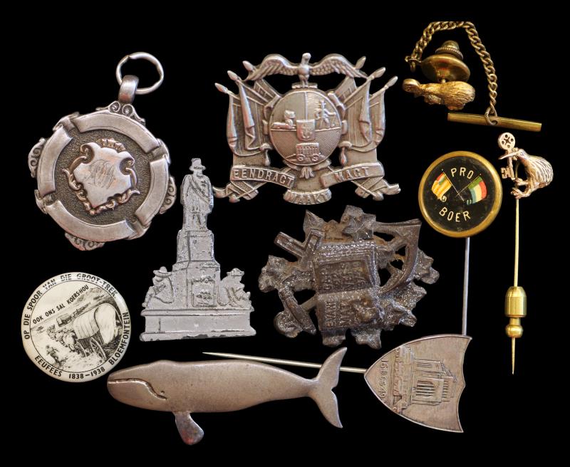 NZ & SOUTH AFRICA, vintage badges (10), noted NZ (2) both Kiwi with key in beak, one marked 9ct, 1.2g; South Africa incl "Pro Boer" with Transvaal & Orange Free State flags, Transvaal Staats Artillerie badge of the ZAR 1874 - 1900 approx, lugs intact; Great Trek badge 1938 & Voortrekker Monument badge, silver 1949. F - EF