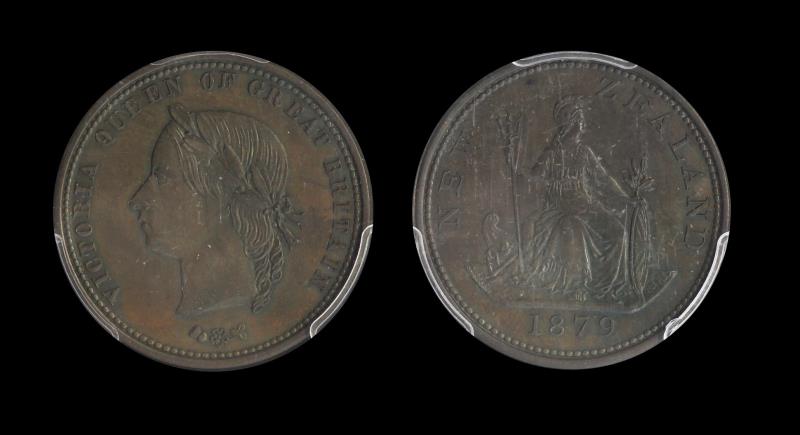 NEW ZEALAND PATTERN PENNY 1879, by Joseph Moore, Birmingham, A399, ex Mowbray Auction 16, 14/10/2016. Even brown tone with underlying brilliance, PCGS rated SP62BN, Number 411269.62, Cert 80117378. UNC