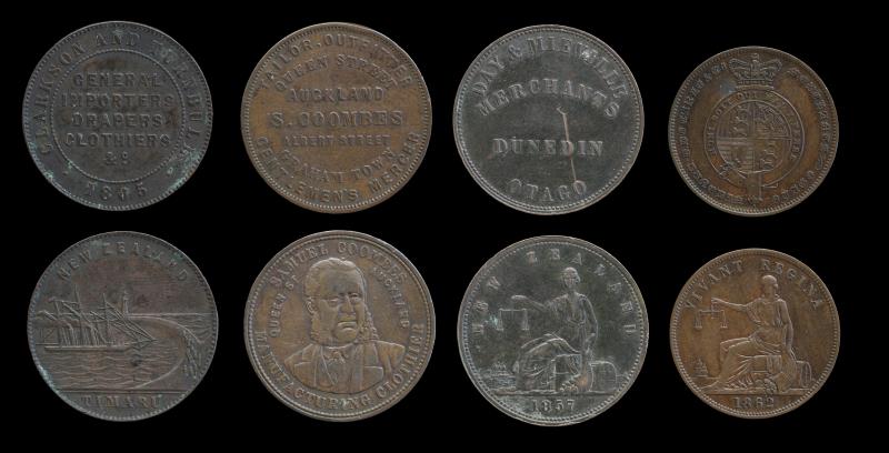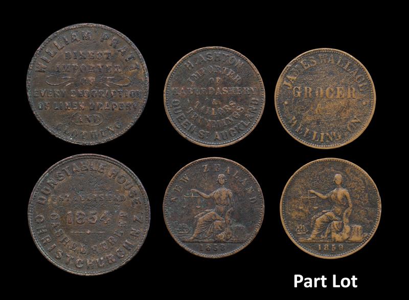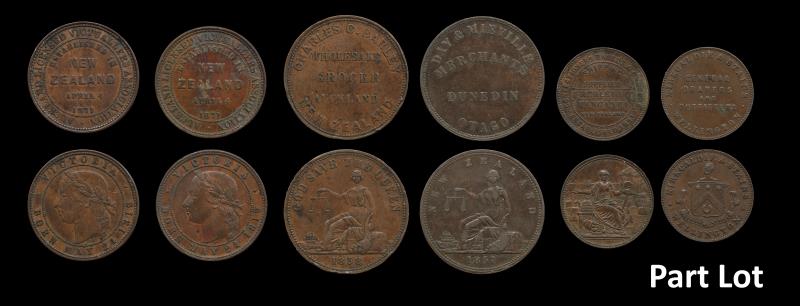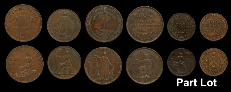 NZ (8), Pennies (6), Ashton 1863, A22, aVF; Auckland Licensed Victuallers 1871, A326, gVF; Caro, A62, VG; Coombes, A77, e/k, VF; Pratt 1854, A445, aF; & Reece, A449, sl bend, F; Halfpennies (2), James Wallace 1859, A593, e/k, VG; Ashton 1858, A19, VF; all toned, most with pitting. VG - gVF