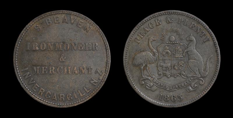 S BEAVEN Penny 1863, Invercargill, A42, R53, better example. gVF