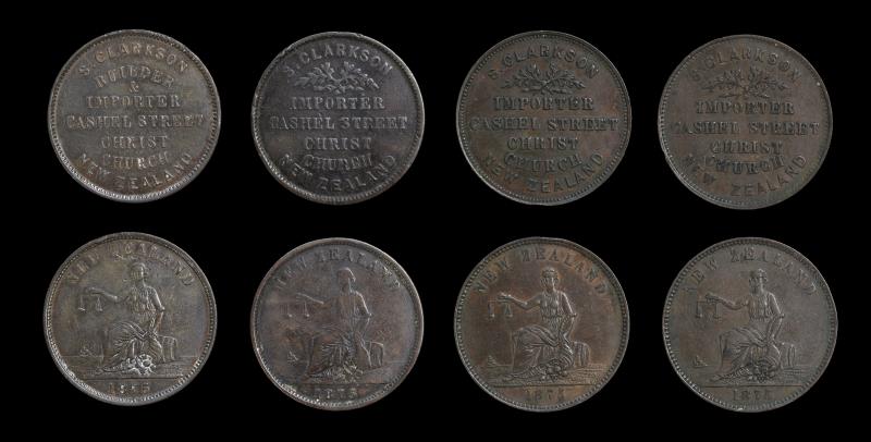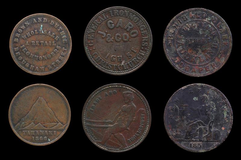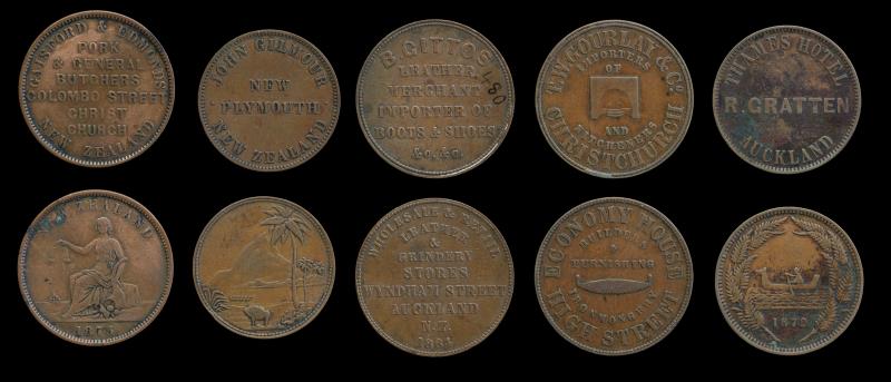 PENNIES (5), GAISFORD & EDMONDS 1875, Christchurch, A142; J GILMOUR Penny, ND, New Plymouth, A143; B GITTOS, 1864, A149, Ink Obv, VF; T W GOURLAY Penny, ND, Christchurch, A151, gVF; & R GRATTEN, Penny, 1872, A152. F - gVF