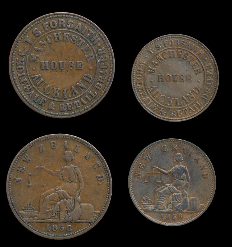 T S FORSAITH (2), Penny 1858, Auckland, A130, aVF; & Halfpenny 1858, Auckland, A131, EF. Forsaith was a NZ Premier. aVF - EF