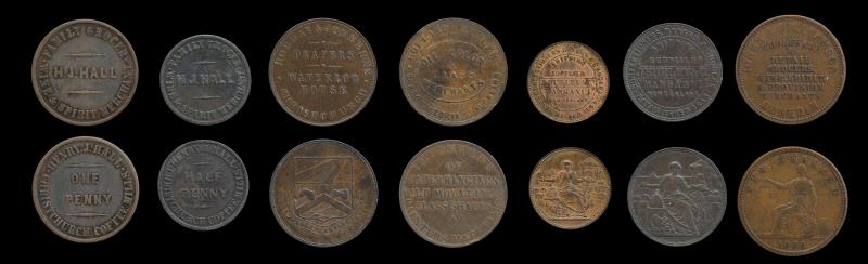 NZ (7), H J HALL Penny A159, gVF, & Halfpenny A161 VF; HOBDAY & JOBBERNS, Penny, A249, heads touch line, dig Rev, gVF; HOLLAND & BUTLER, Penny, ND, A263, VF; J HURLEY & CO, Penny A276, EF & Halfpenny, A277, aVF; & JONES & WILLIAMSON, Penny 1858, A308, F. F - EF