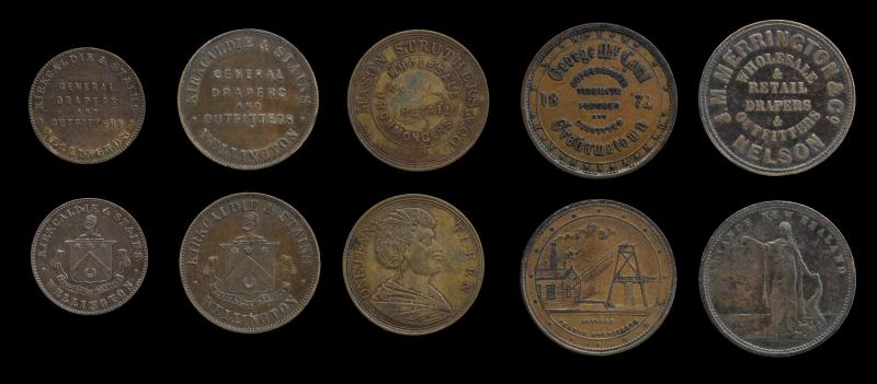 NZ (5), KIRKCALDIE & STAINS Penny, A311 & Halfpenny A312, gVF; Mason Struthers Penny, A355, VF; GEORGE McCAUL, Penny A359, VF; & J M MERRINGTON & CO, Penny, ND, A363, F. F - gVF