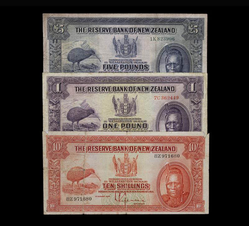 1934-40 LEFEAUX (3), Five Pounds, 1K 823906, staple hole, aF; One Pound, 7C 362449, VG; & Ten Shillings, 8Z 971680, G. G - aF