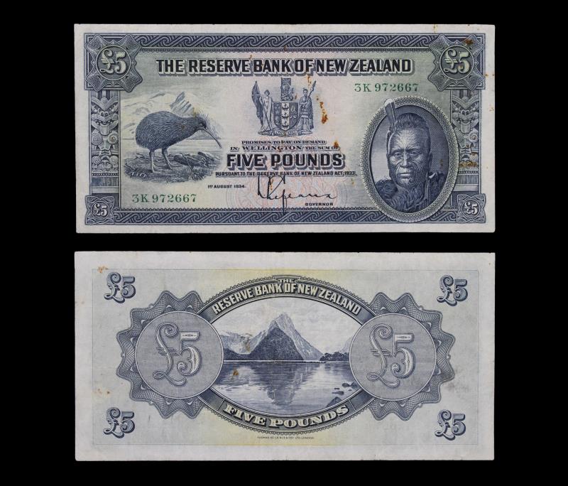 1934-40 LEFEAUX Five Pounds 3K 972667, some rust, washed & small tear bottom margin, colour still bright. F