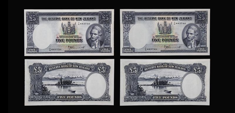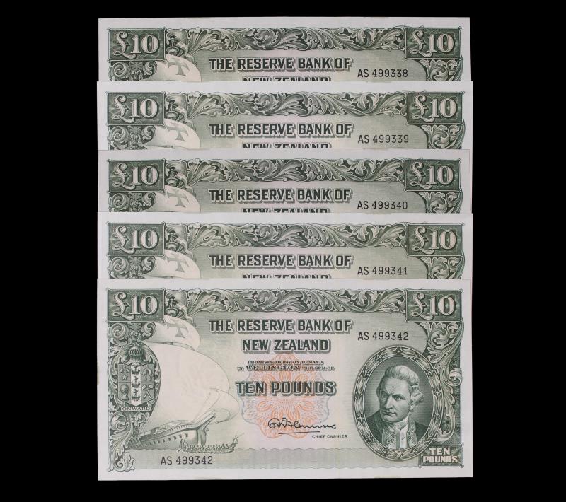 1956-67 FLEMING Ten Pounds (5), AS 499338-42, RBNZ remainder from the last thousand, consecutive run of 5, usual band marks in margin. AU - UNC