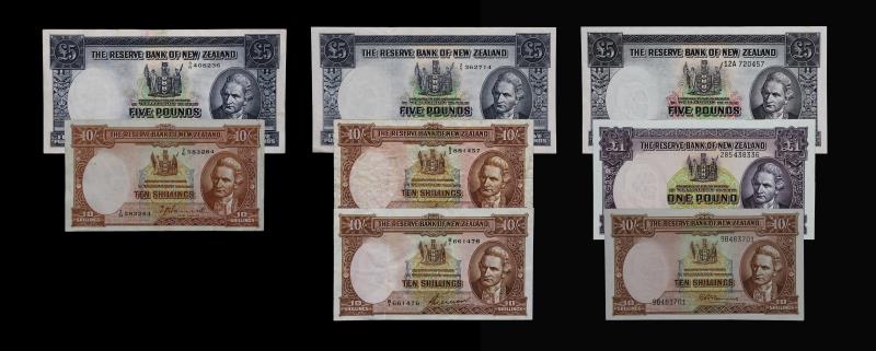 1940-67 HANNA-FLEMING (8), Hanna (2), Five Pounds 3/R, aVF; Ten Shillings 2/51, aVF; Wilson (3), Five Pounds 2/Y, gVF; Ten Shillings (2), B/1, VF; & B/3, F; Fleming (3), Five Pounds 12A, gEF; Pound 285, band marks otherwise AU; & 10 Shillings 9B, AU. F - AU