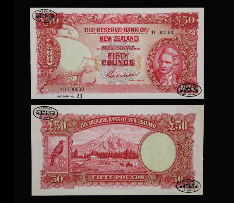 1955-56 WILSON Fifty Pounds 1U 000000, specimen No. 23, black SPECIMEN overprint ovals in corners, rare, some extra paper & typical glue residue on back right margin. gEF