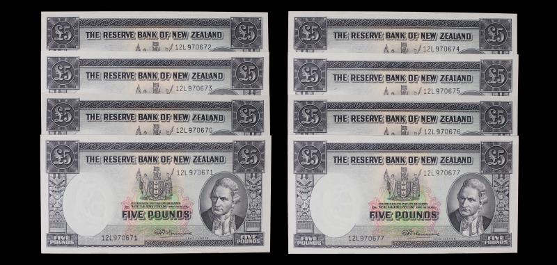 1956-67 FLEMING Five Pounds (8), 12L 970670-77, RBNZ remainder from the last thousand, consecutive run of 8, usual band marks in margin. AU - UNC