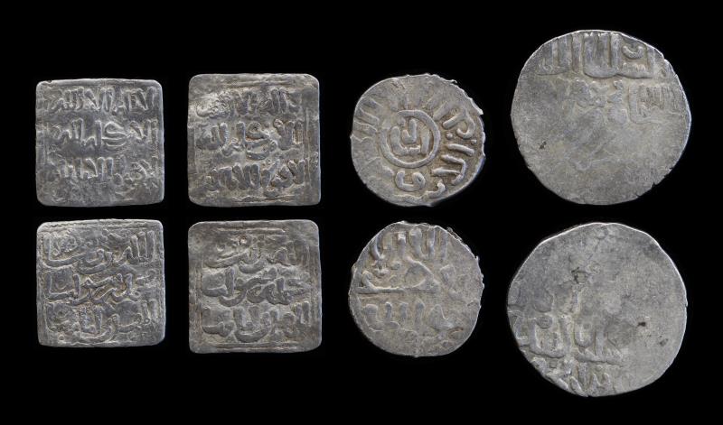ALMOHADS & MAMELUKES, AR dirhams (4), ALMOHADS (2), AH524-667 (1130-1269 AD), 14.5mm square, 1.48 & 1.52g; & MAMELUKES (2), Aynal, AH857-865 (1453-1461 AD), 15mm, 1.57g, mint probably Halab (Aleppo), A-1013; & unknown ruler, 21mm, 3.42g, flan partly flat. F