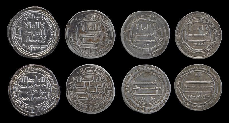 UMAYYAD & ABBASID, silver dirhams (4), AH99-200 (719-816 AD), each approx 2.9g, Sulaiman, AH99, A-131, Wasit mint (Iraq), 26.3mm, cleaned EF; Hisham, AH123, A-131, Wasit mint, 25.4mm, slightly bent, otherwise VF; al-Mansour, AH155, A-213, Madinat-as-Salam (Baghdad, Iraq), 24.8mm, F; al-Ma'mun, AH200, A-223.4, Isfahan (Iran), 24mm, EF. F - EF