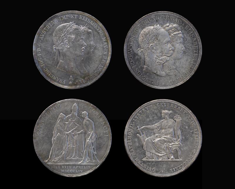 AUSTRIA (2), 2 Gulden 1854, kmXM3, Franz Joseph I Royal Wedding; & 2 Florin 1879, kmXM5, Silver Wedding Anniv; both .900 silver, both with some light cleaning & r/n's otherwise gEF.