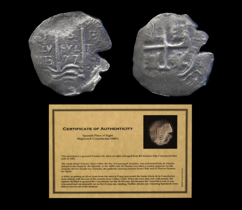 BOLIVIA 8 Reales 1677 P E, silver cob, Charles II, Potosi mint, km26, .931 silver, 14.77g. From the shipwreck Consolacion. The Consolacion was a Spanish treasure ship that sank in 1681 after encountering pirates, with cert. VG/G