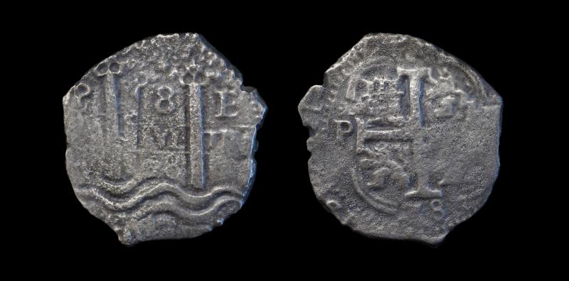 BOLIVIA 8 Reales 1678 P E, silver cob, Charles II, Potosi mint, km26, .931 silver, 18.73g. From the shipwreck Piedmont, wrecked in Lyme Bay, Dorset, 1795, with cert. F