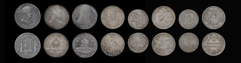 BOLIVIA (8, all silver), 8 Reales 1815, km84, gF; 8 Soles (3), 1827, km97, EF; 1840, km103, VF; 1863, km138.6, toned, aEF; 4 Soles 1830, km96a.1, VG; Melgarejo 1865, km146, aVF; 1/2 Melgarejo 1865, km145.1, scr, tone, VF; & Boliviano 1874, km160.1, gVF; most with cleaning. VG - EF