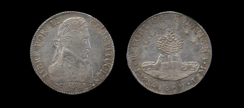BOLIVIA 8 Soles 1827 PTS JM, km97, flan crack Obv, cleaned otherwise gEF.