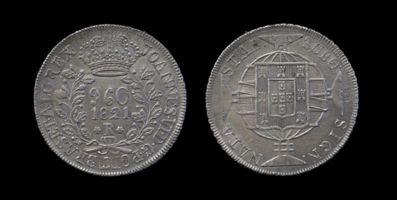 BRAZIL 960 Reis 1821 R, Rio de Janeiro mint, km326.1, .902 silver, overstruck on a Chile Peso 1821 FD with a lot of underlying details still present. EF