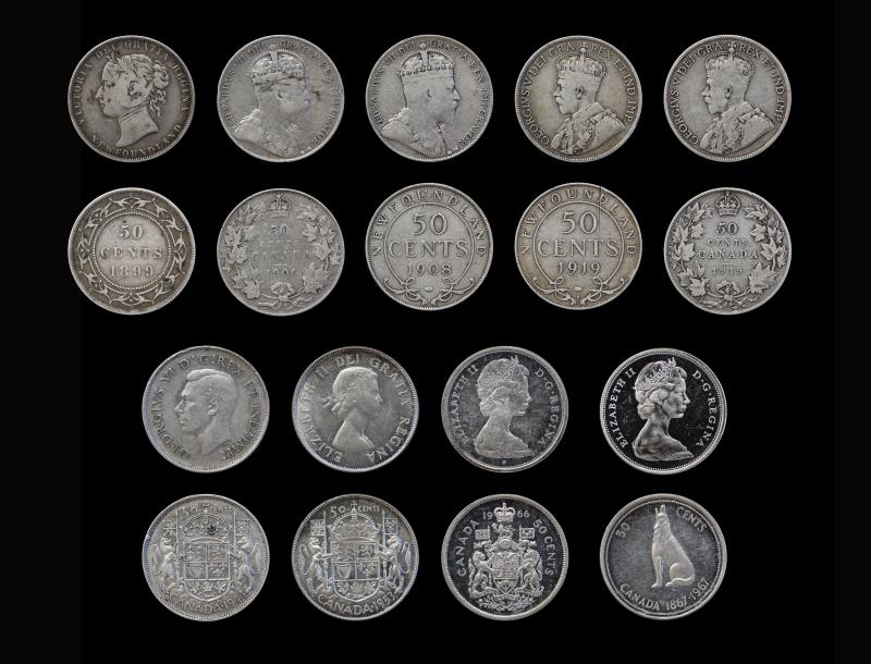 CANADA 50 CENTS 1899-1969 (9, all silver), 1899 Newfoundland, km6, Scr Obv; 1906, km12; Newfoundland 1908, km11; Newfoundland 1919C, km12, Scr's Rev; 1919, km25; 1944, km36; 1953, km53; 1966, km63, Scr's Obv; 1967, km69, PROOF; 2.9 oz ASW. VG - PROOF