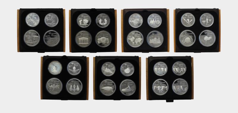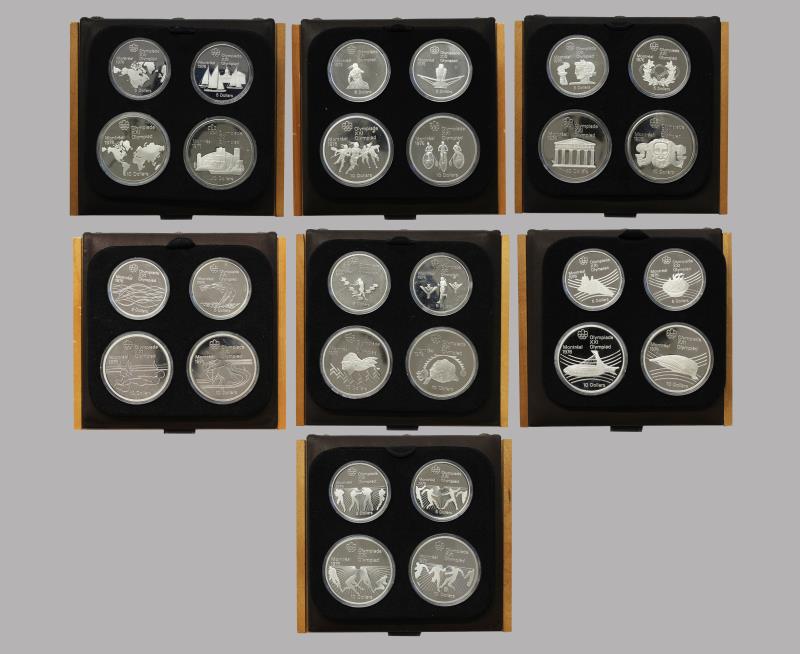 CANADA OLYMPIC PROOF SETS (7), 1973-76 each $10 (2), & $5 (2), kmOCP1-7, all .925 silver, total 30.2 oz ASW, all cased & boxed by year. PROOF