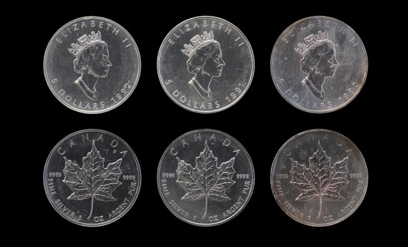 CANADA (3), Five Dollar 1 oz Maples, 1990 (toned), 1991 & 1992, km187, .9999 silver, 3 oz total ASW, all in sealed holders. BU