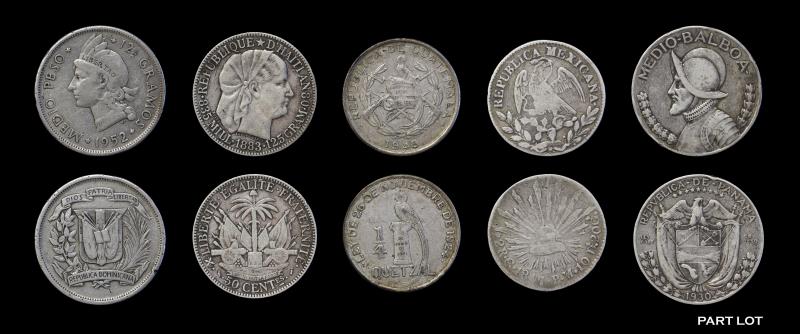CENTRAL AMERICA & CARIBBEAN (37, all silver), 1883-1953, incl Cuba, Dominican Republic, Guatemala, Haiti, Honduras, Mexico, Nicaragua, & Panama; Noted Dominican Republic 1/2 Peso 1952, km21; Haiti 50 Cent 1883, km47; Guatemala 1/4 Quetzal 1948, km243.2; Mexico 2 Reales 1847, km374.8; Panama 1/2 Balboa 1930, km12.1, e/k; approx 7 oz ASW, some with cleaning & tone. G - EF