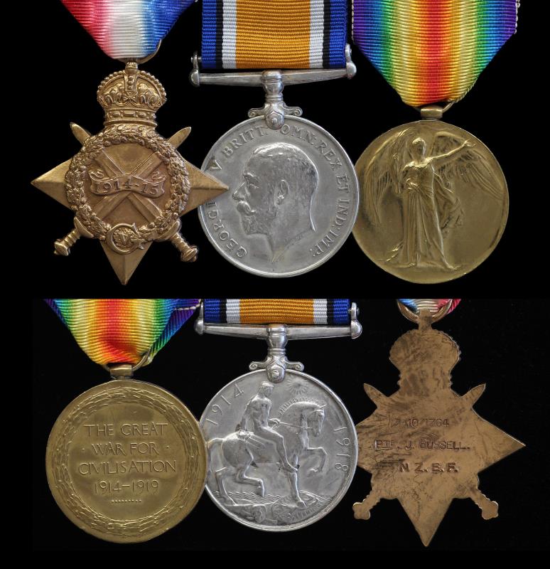 NZ WWI Trio, 1914-15 Star, BWM & VM, impressed 10/1764 PTE. J. BUSSELL. N. Z.E.F. James Bussell, a farmer from Colyton, Feilding, took part in the assault by the Wellington Regiment on Chunuk Bair & was captured there by Turkish forces with seven others, amongst very few prisoners taken alive at Gallipoli. With service papers, photos & details of captivity on 8 August 1915, recording his head and leg wounds & death in Turkish captivity on 17 October 1916. Swing mounted. aEF