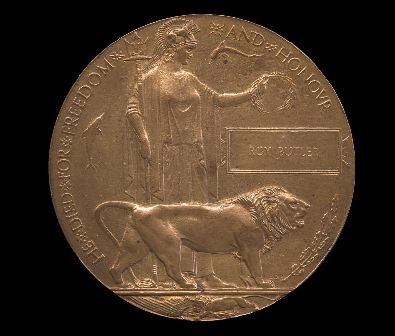 NZ Memorial Plaque to Roy Butler. Butler (bn Palmerston North, 1895), was a clerk with the Post Office, enlisting at 17 as a Rifleman with H. Coy of the 3rd Battalion of the NZ Rifle Brigade on 26/6/1916 (service no 28426). On 1/8/1917, he qualified as a Signal Instructor at a Signalling Course, Weymouth. He died of wounds on 12/10/1917. EF